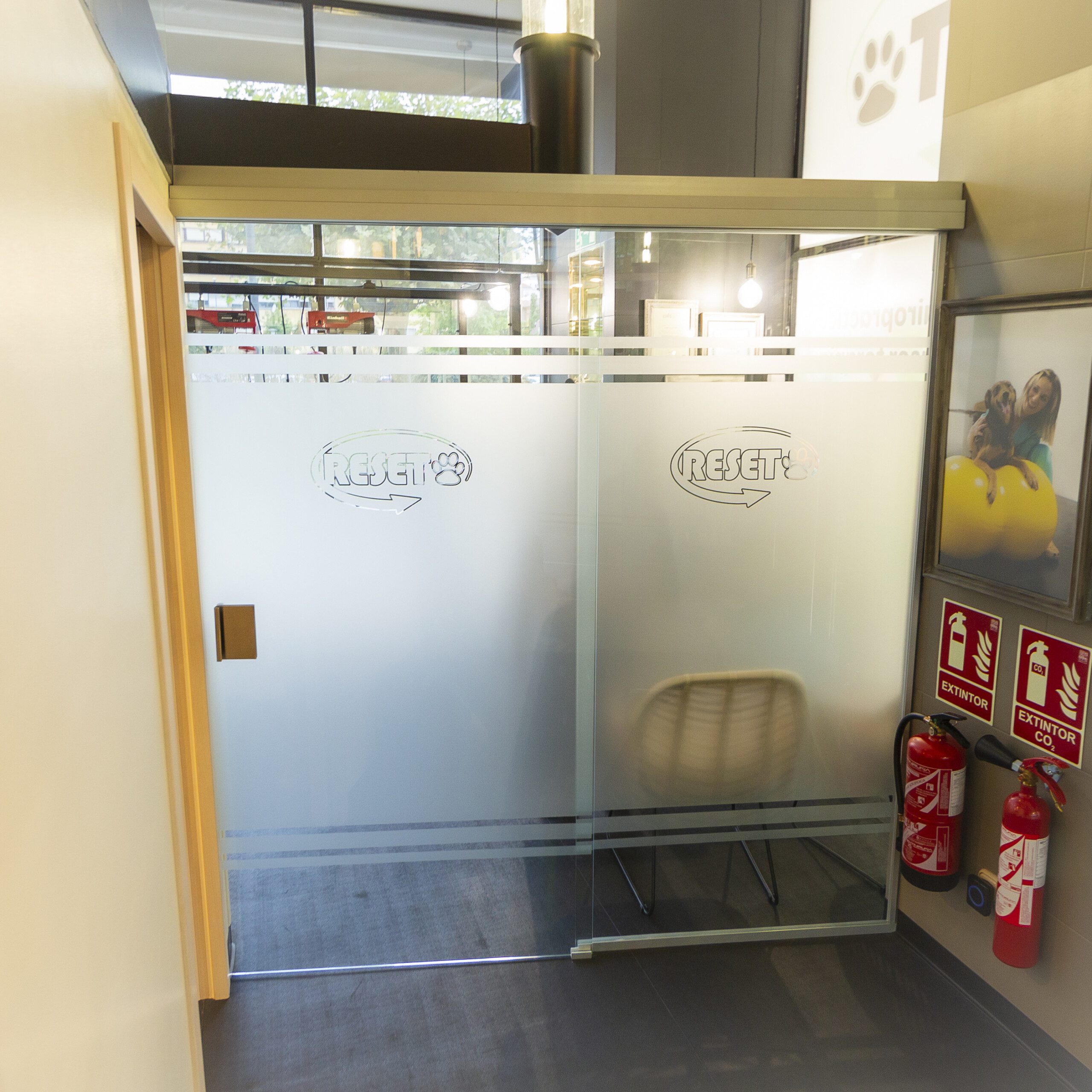Rotulación de puertas de cristal con vinilo blanco en reverso e imagen impresa. Placa identificativa en metracrilato transparente. Señalización interior en letras corpóreas en PVC negro.